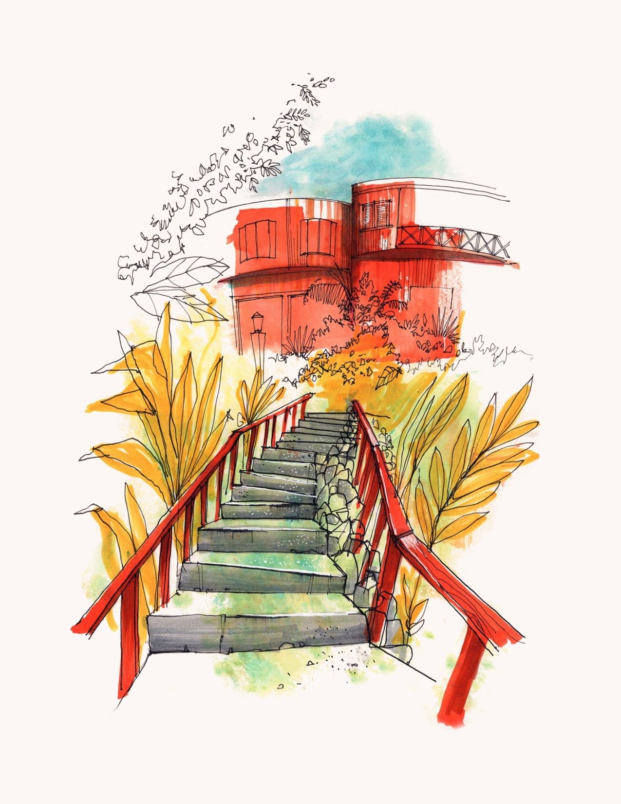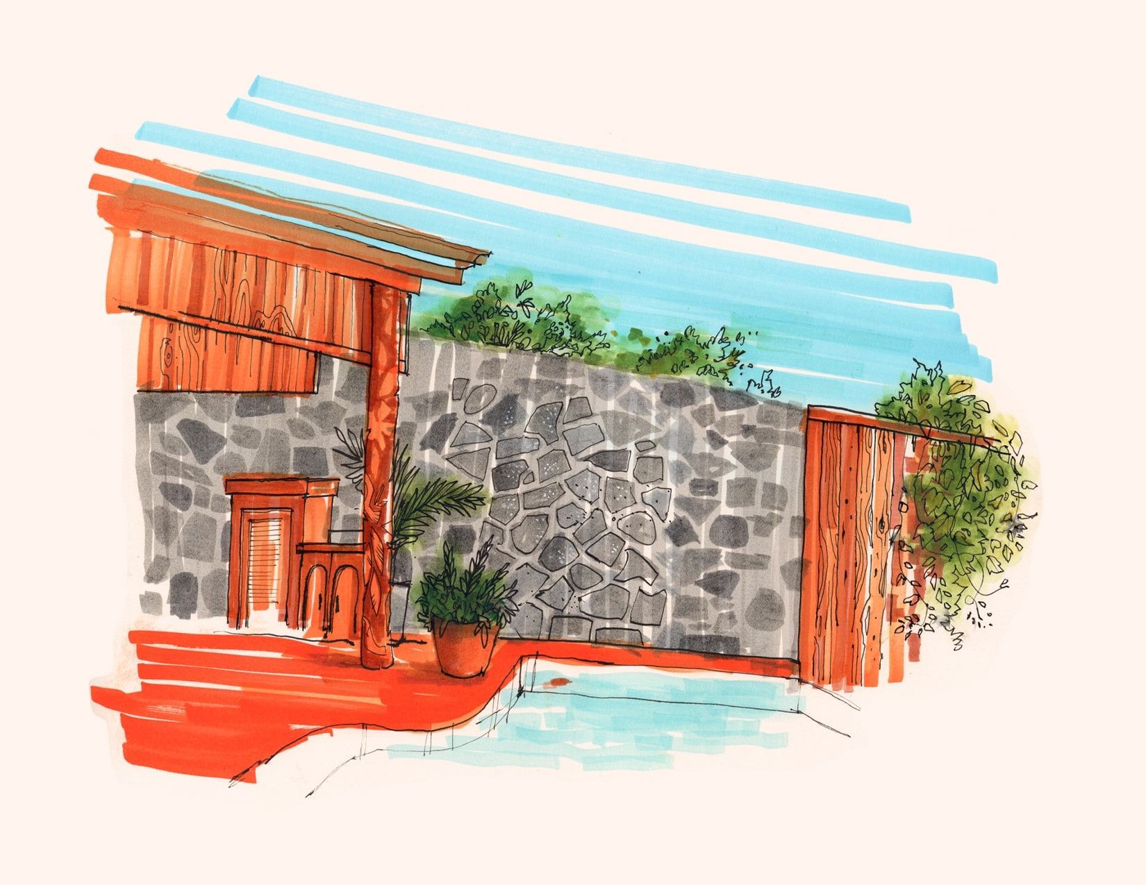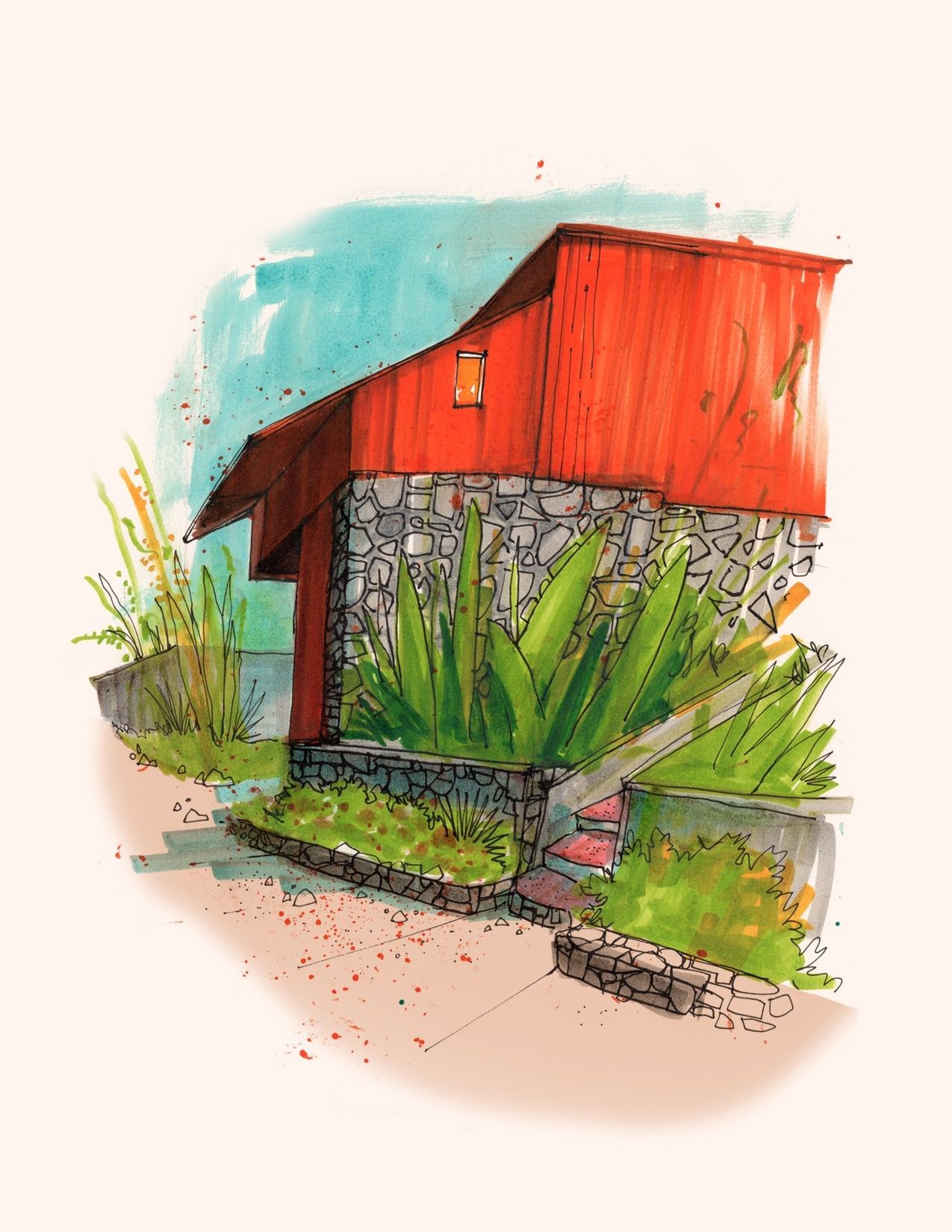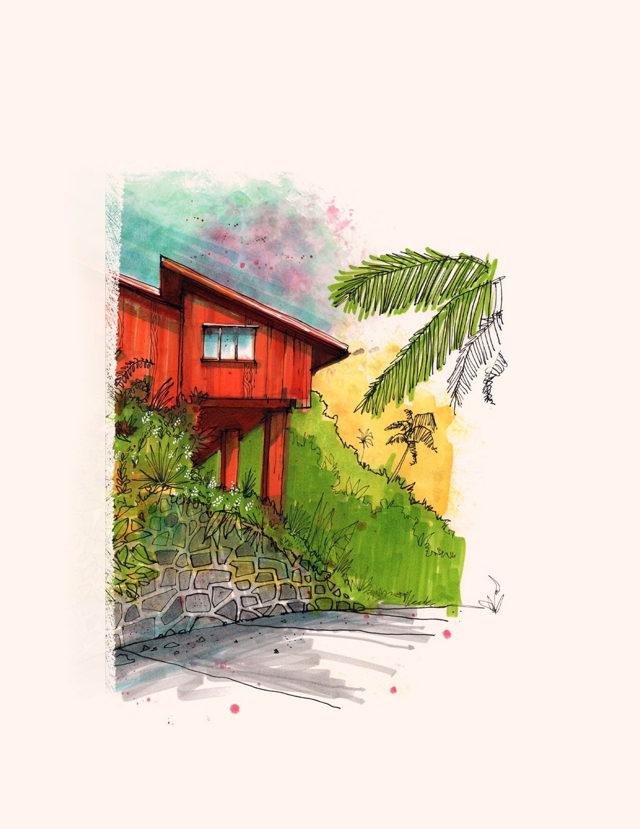 At his core, Brandon works with pen and ink often using fountain or dip pens, brush markers, and a reduced color palette. His aesthetic is shaped by mid-century modern illustration and editorial art: bold graphic forms, simplified subjects, expressive linework, and spontaneous energy. He says he often foregoes preliminary pencil sketches, choosing instead to dive directly into ink to preserve an immediacy of mark and gesture. The subject matter ranges from homes, street scenes, stylized portraits, to cocktail culture and classic Hollywood all rendered with a nostalgic yet fresh perspective.